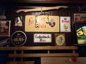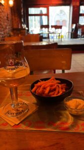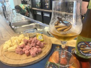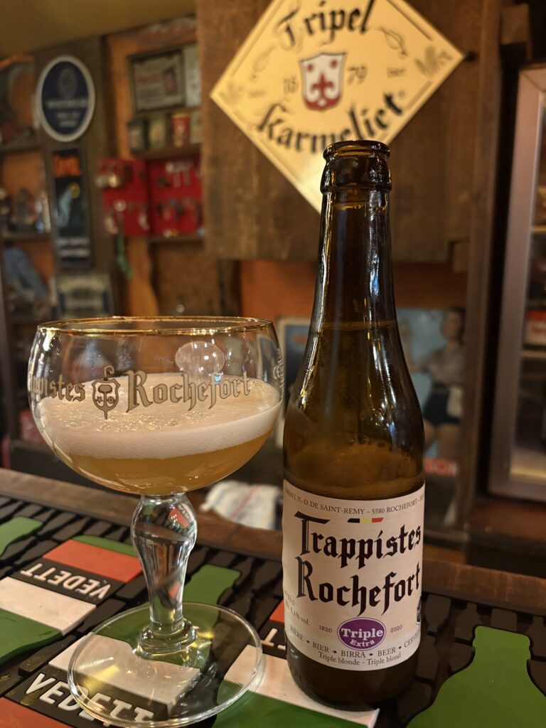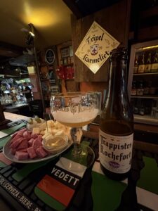 Ek kry ‘n Rochefort Tripel – weer ‘n trappist deur monnike in ‘n klooster in die suide van België. Hierdie is sover ek weet die enigste blond wat hulle brou. Ek hou van die satyn-sagte tekstuur en spesery-tipe smaak… dit gaan goed saam met die hoes-sterk mostert van die portie gemengd wat my oë laat traan.