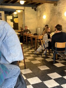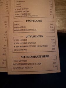 Ek staar na die geraamde foto’s teen die mure van Gent-persoonlikhede: musikante, digters, dramaturge, politikusse, karakters, en legendariese stamgasten. Die plek is nie baie besig nie – paar mense wat kom en gaan, en ek geniet die tariewe op die drankkaart.