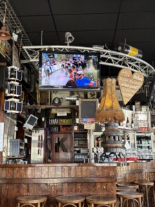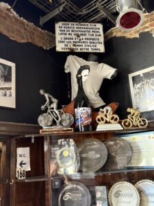 Die plek drup koers (fietsry-sport) – met trofeës en fotos en handtekeninge en fietsparte in elke hoek en teen elke muur en van die bruin hout-plafon af. En daar is genoeg TV-skerms om vandag se Scheldeprijs te kyk.