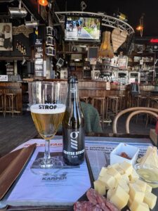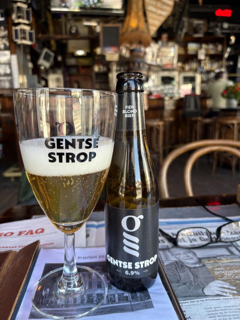 Ek noem aan meneer Keisse dat ek graag iets plaasliks sal waardeer, maar nie die omgewing se biere ken nie. Hy bied ‘n Gentse Strop aan. ‘n Lekker “fiere” blond. Miskien effe aan die bitter kant, maar heel goed.