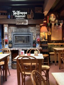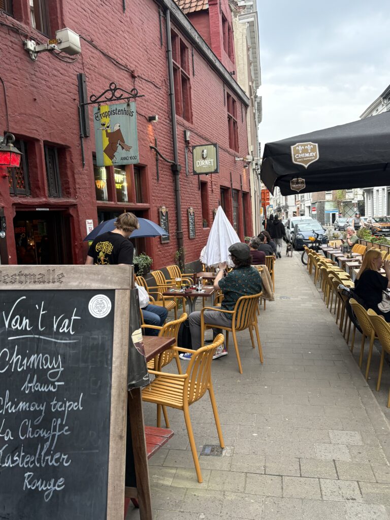 In Trappistenhuis speel die mooiste oue blues-musiek. Dis heerlik donker en bruin binne – met sware kroeg-dekor. Buite in die “son” sit Vlaamse ouens met Andy Capp-kêppe en kleurvolle skoene en maak luide grappe.