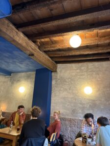 Lekker klein en beknop binne. Goeie musiek wat speel. Meeste besoekers sit buite op die terras. Ek sit binne by die trap, en bekyk die Amerikaners, Britte en Spanjaarde wat van buite af die toilet kom soek, die tipiese steil trap ondertoe een kyk gee, en ongedane sake weer omdraai.