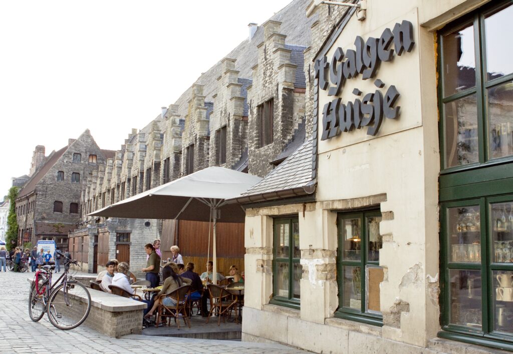 In die toeriste-area van Gent. Op die groentemark-plein – al sedert die middeleeue. Baie besig bedags. Oop van 09:00 tot 18:00. (Vreemde tye, ja. My nuuskierige navraag oor waarom sulke tye kry net ‘n skouerophaling met gelyktydige uitblaas van lug deur half-toe lippe.)