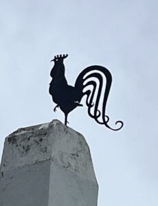 Tom wanted R490 000. Steep for us, but with some stretching we would just be able to make the bond payments. Radie – the estate agent principle – suggested we put in a lower offer (as the property was not in the “normal” type of condition for a family with young children), but we wondered… We negotiated with Tom: sell the house at that price WITH the two chandeliers in the sitting room (hand-made by him), as well as the magnificent metal rooster on the roof (also made by Tom). Tom said “OK – but then you have to take the three geese walking in the almond orchard as well.“.